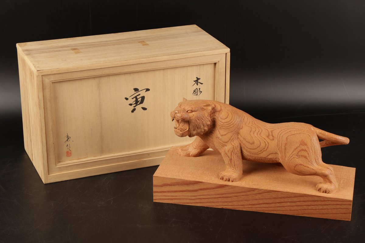 > [URA]畠山勲 作/木彫『寅』置物/W37.1cm/7-9-86 (検索)骨董/木彫/アート/インテリア/彫刻/置物/飾物/干支