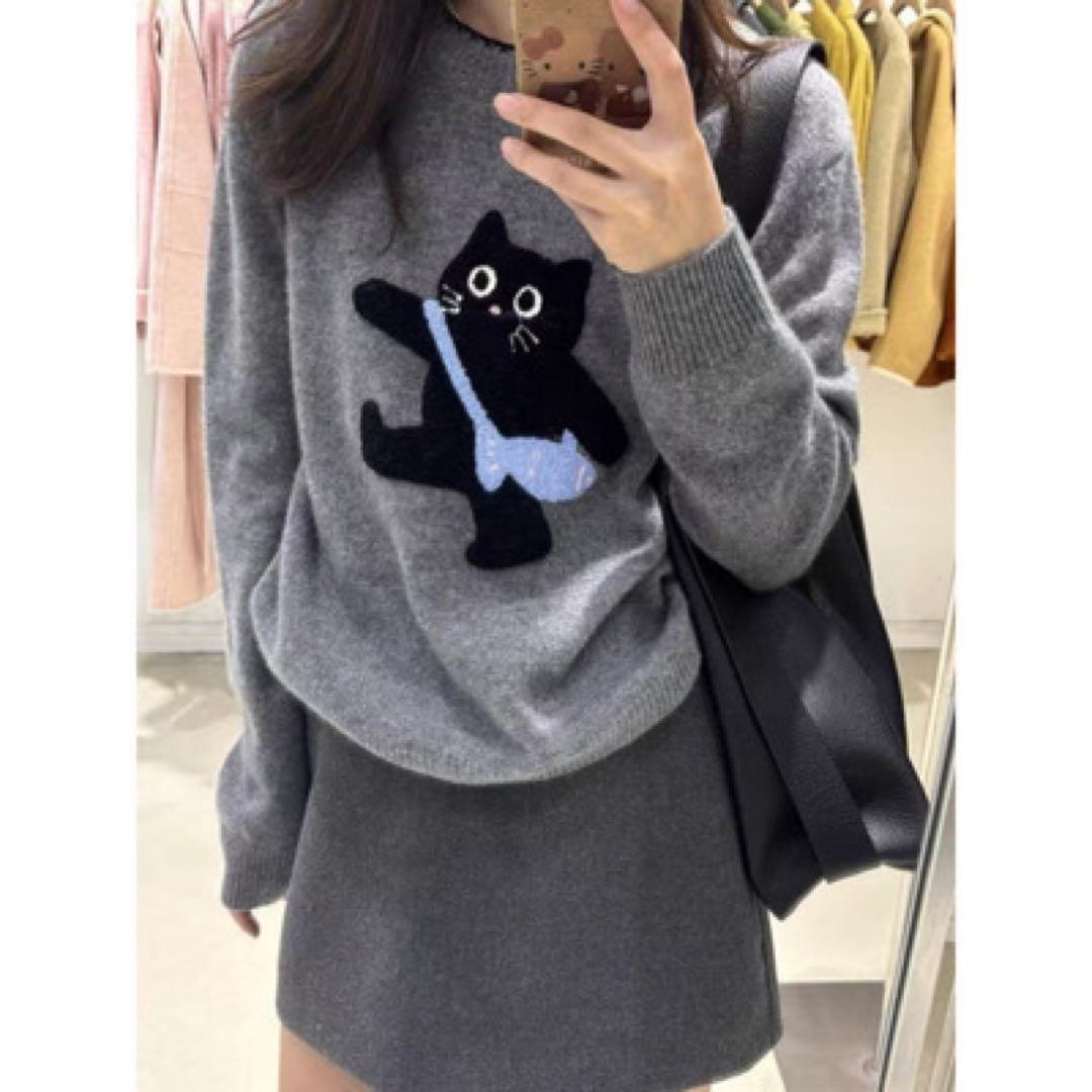 - 残り1点 猫刺繍 グレー ニットセーター 長袖 送料無料 新品
