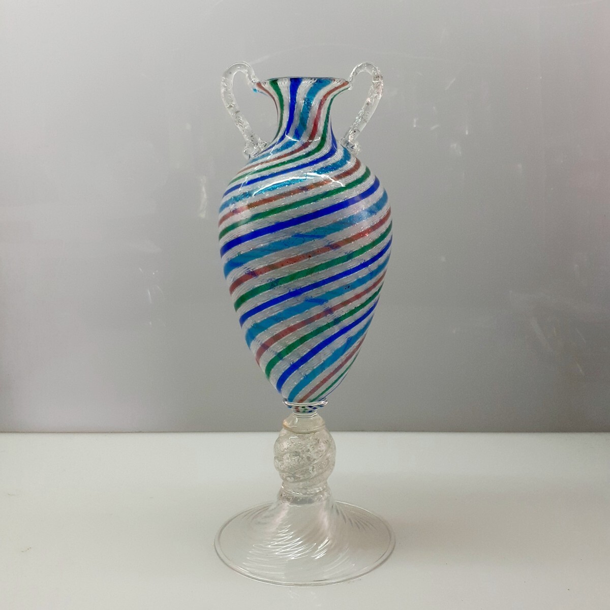- 【MURANO】ITALY★ムラノ 銀彩 双耳 カラフル ライン 花器 花瓶★ヴェネチアン グラス ムラーノ 島 ベネチアン ガラス
