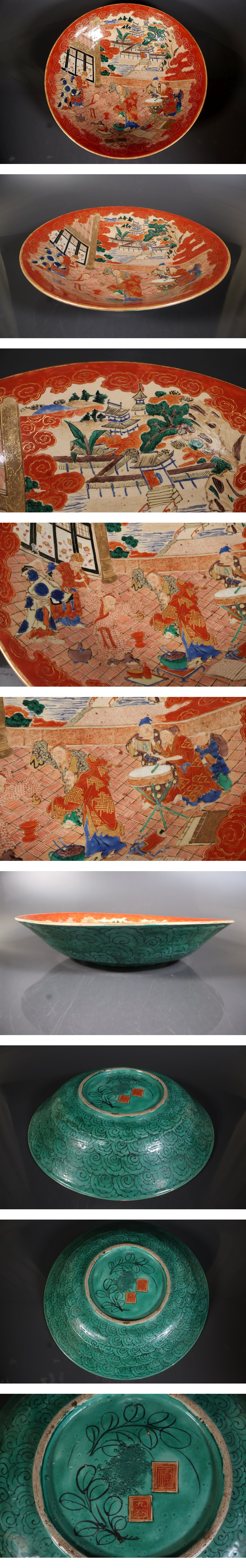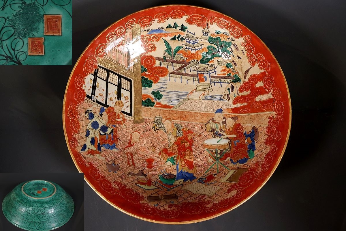 - 【小】5330 明治時代 再興九谷 上手九谷の逸品 色絵金彩人物文大平鉢 大皿 保管箱有