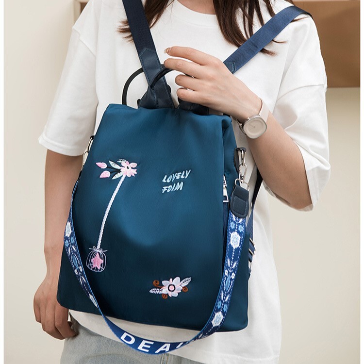 - レディース リュック デイパック おしゃれ 刺繍 花 かわいい 韓国 軽量 防水 小さめ きれいめ 軽い 50代 40代 旅行 薄型 ネイビー NE0220