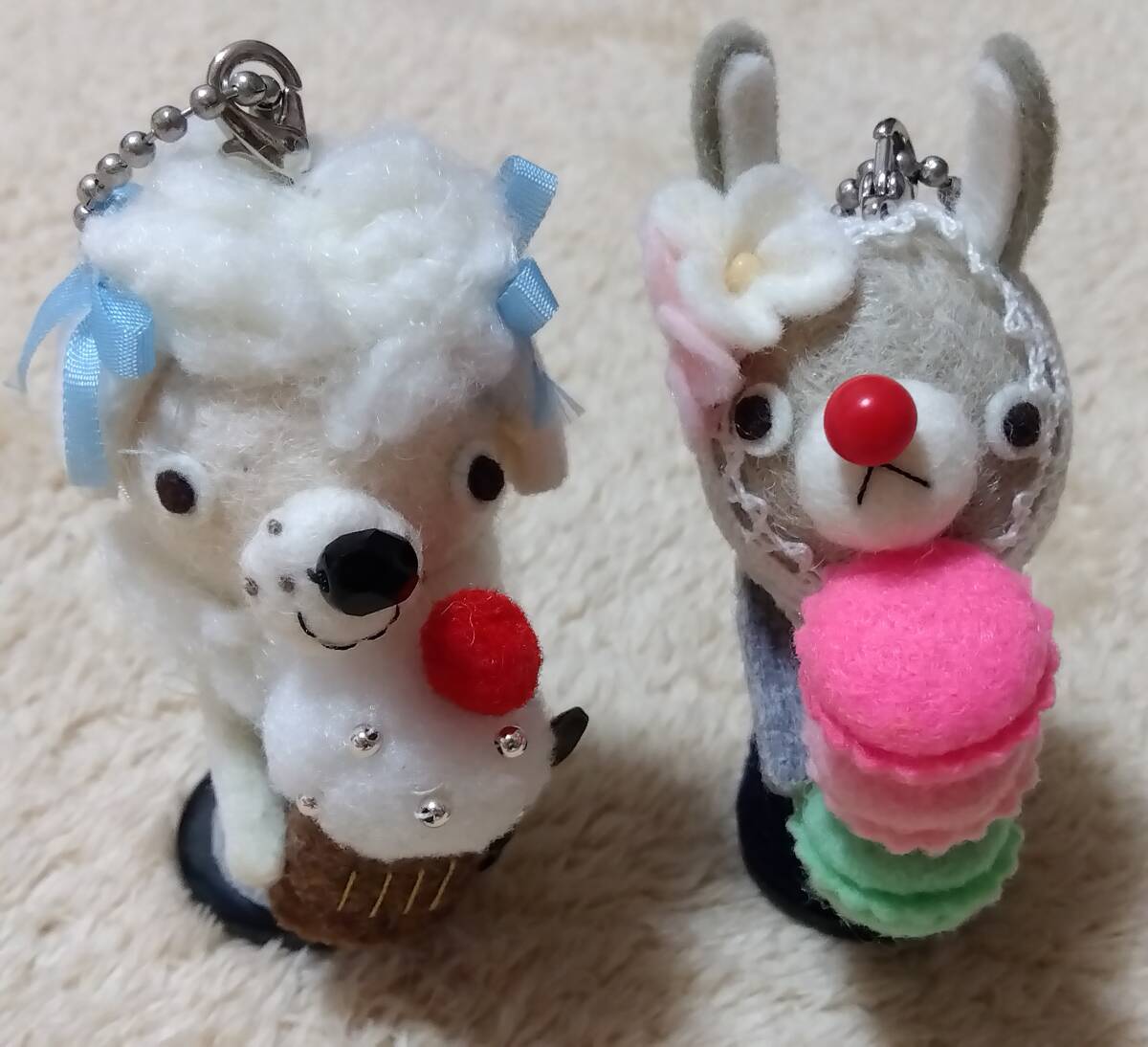 > ハンドメイド作家さんの羊毛フェルトキーホルダー カップケーキプードルとマカロンうさぎ 2点セット クリスマスツリーのオーナメントにも