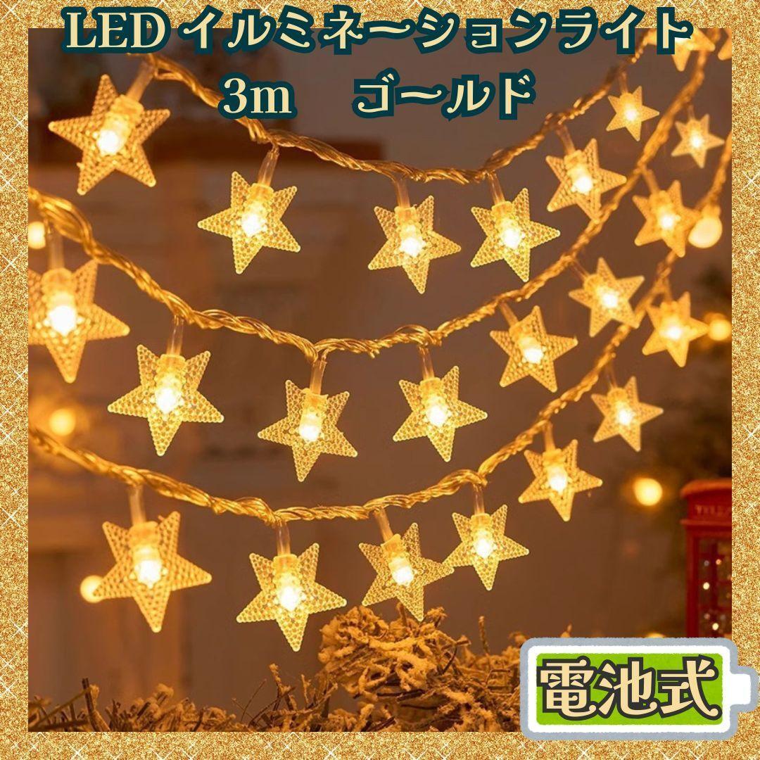 - イルミネーション LED ライト 3m 20LED 星型 電池 電飾 ゴールド