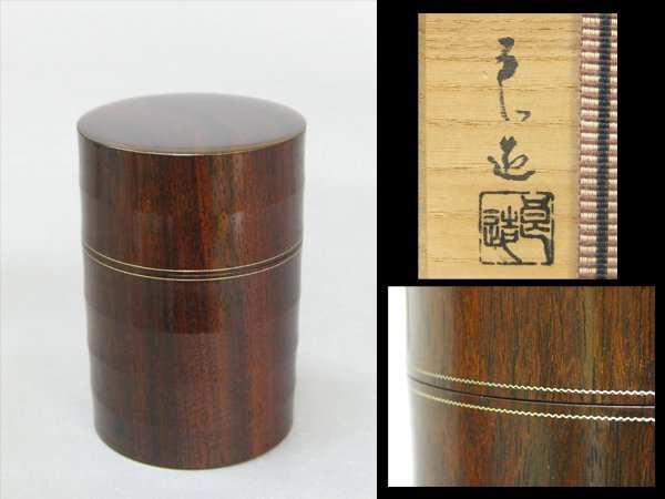 - 【心庵】人間国宝 川北良造 紫檀造 銀線象嵌/茶筒 茶入 共箱 茶道具 B092