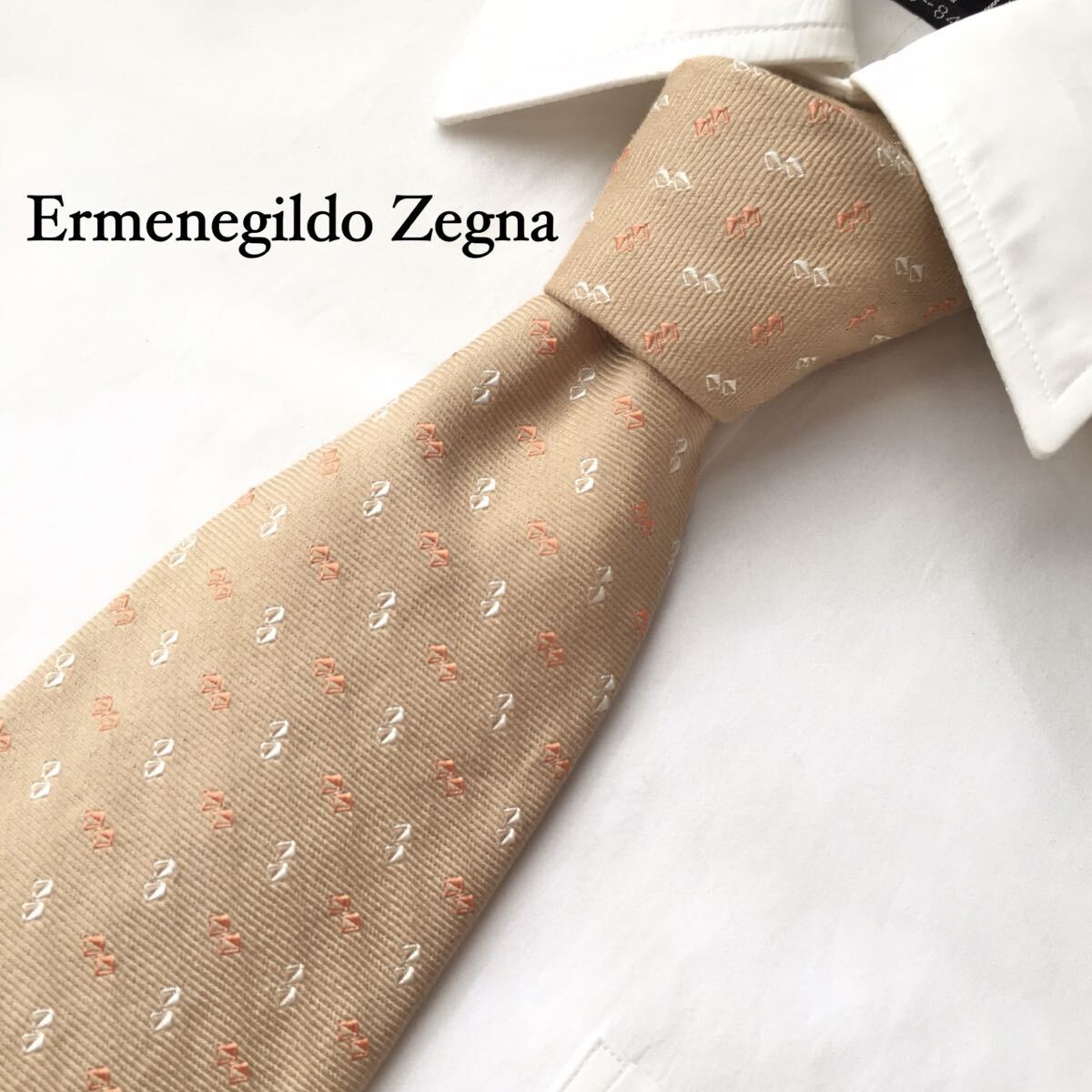 - Ermenegildo Zegna エルメネジルドゼニア シルク 絹 コットン 綿 ネクタイ 小紋柄 ベージュ系 イタリア製 ビジネス カジュアル 紳士