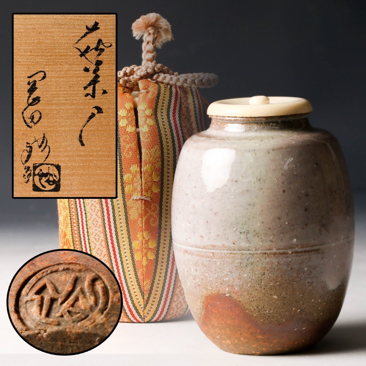 【佳香】岡田裕 萩茶入 共箱 仕覆(薩摩手華紋) 栞 茶道具 本物保証