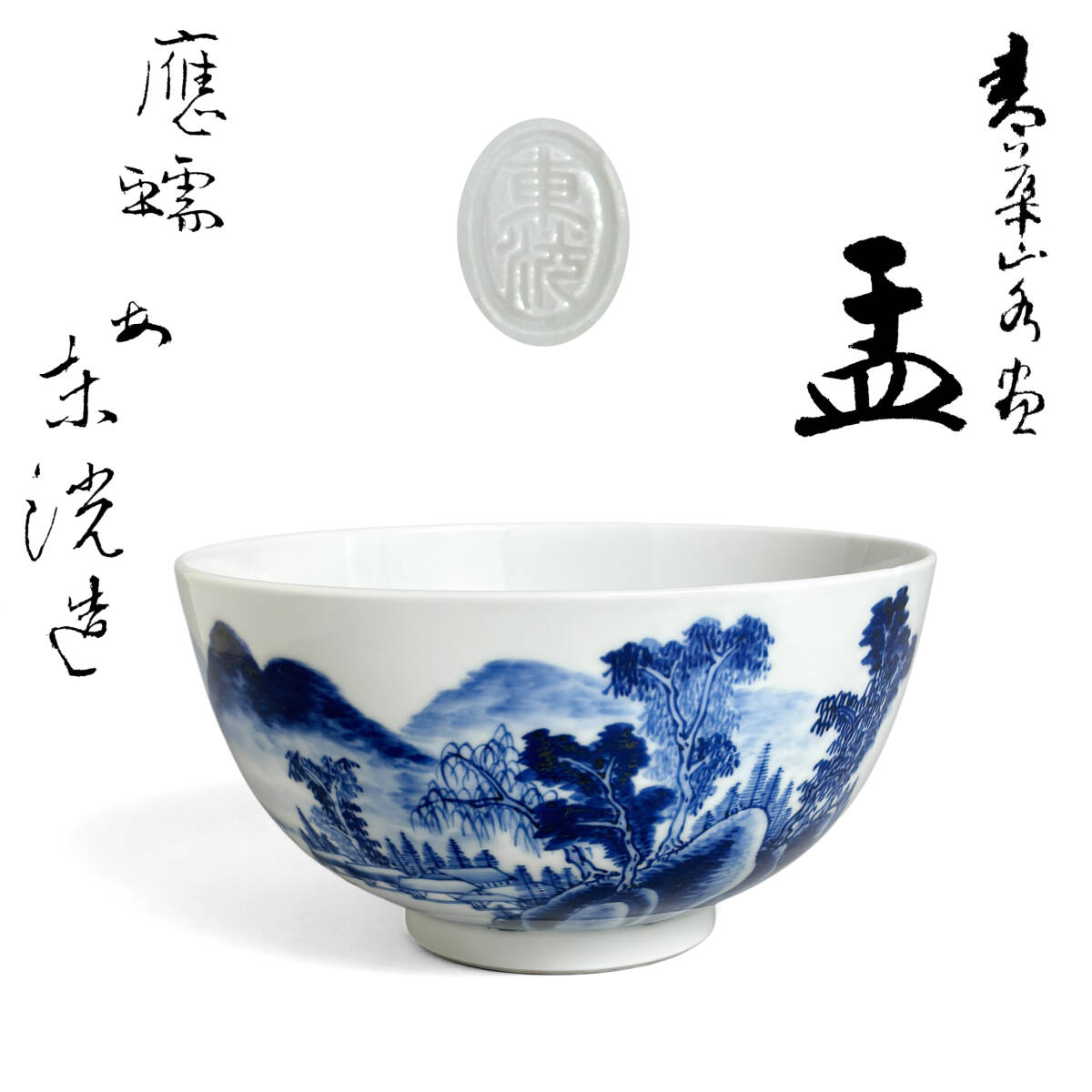 - 東洸造 染付 青花 茶碗 山水図 工芸磁器 骨董 茶道具 共箱 日本美術