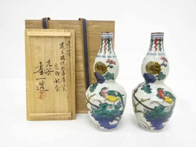 - 九谷焼 腰田基一造 色絵 花鳥図 瓢形 徳利 一対 (IBF2DHP-025)