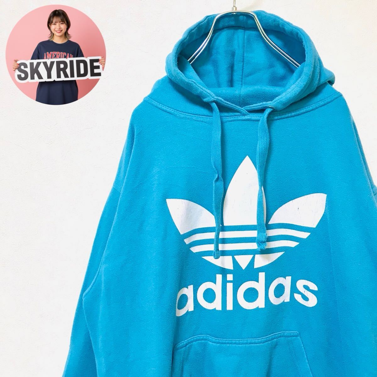 > 【人気】adidas アディダス パーカー ブルー Lサイズ トレフォイルロゴ ビッグシルエット プリント スポーツMIX ストリート 古着 #TT0350