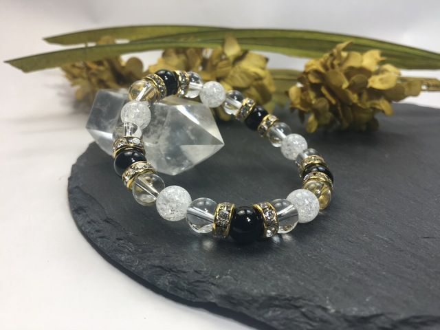 > オニキス&水晶&クラック水晶 パワーストーン ブレスレット 天然石ブレス (ゴールド) 幸運 開運 4月 誕生石 クリスタル レディース