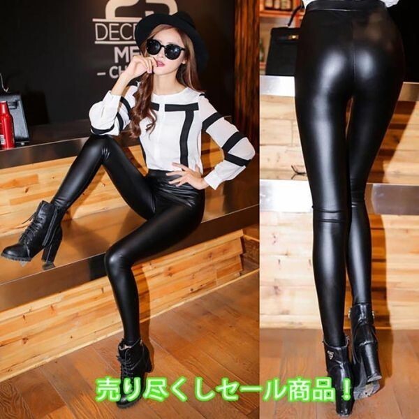 - フェイクレザー レギンス ハイウエスト スリム スキニー ストレッチ 裏起毛 光沢あり ロング丈 レディース ブラック XL