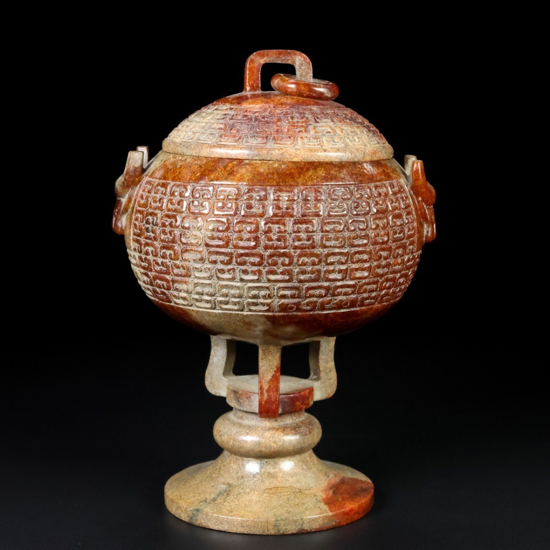 - 「漢代 和田玉 高古玉彫り 満工牛耳炉」極細工 賞物 中国古美術 旧蔵出