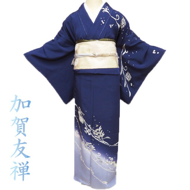 > 特選 訪問着 着物 中古 正絹 袷 フォーマル 加賀友禅 松島由美 落款 花の図 紺色 多色 身丈155.5cm 裄65cm SA きもの北條 A1277-9