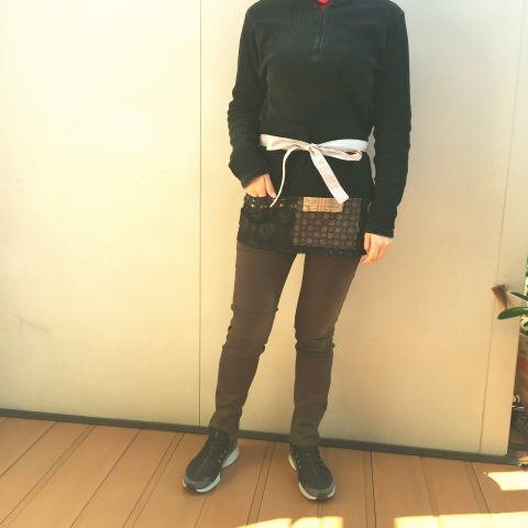 - 着物素材使用【長めサイズ】1400円黒地にパッチワーク絣文ポケットカフェエプロン