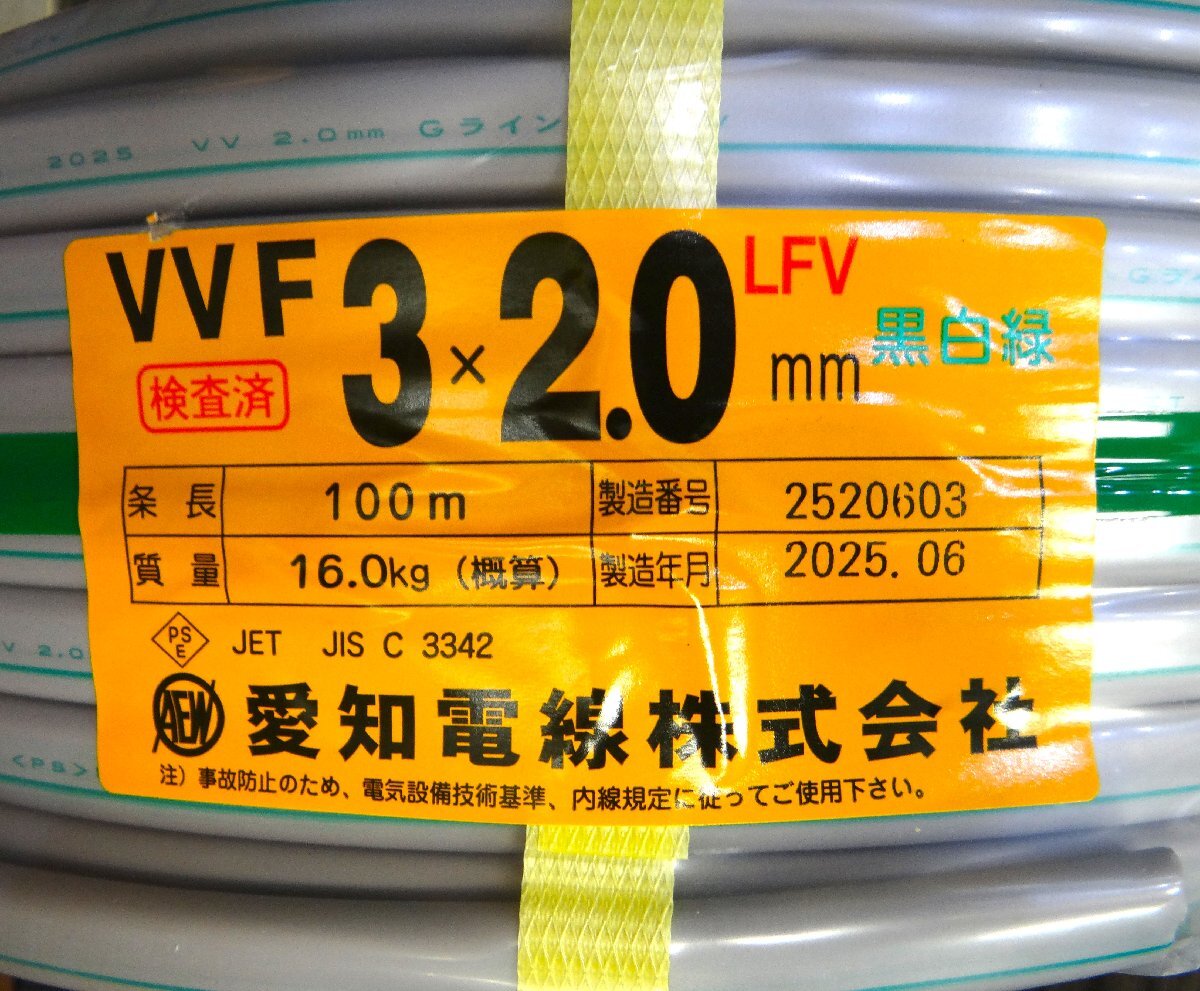 - ◆ごえん堂◆新品◆愛知電線 VVF 3×2.0mm 16Kg(黒白緑)VVFケーブル 3C×2.0mm×100m 製造年月 25/06 14
