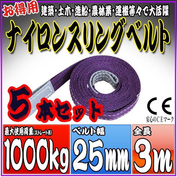 > スリングベルト 5本セット 3m 幅25mm 使用荷重1000kg 1t 1.0t 吊りベルト ベルトスリング [ナイロンスリング 吊上げ ロープ 牽引 運搬]