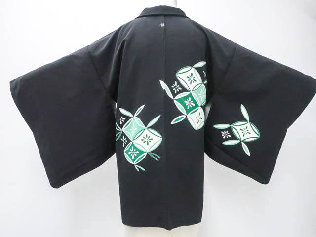 > 《古美術京松》リサイクル着物 黒羽織 昭和レトロ 縫紋 七宝文 羽織紐付 正絹 身丈約74.5cm 裄丈約62.5cm kyo7z06-708