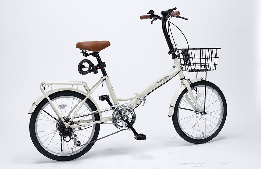 - 送料無料 折り畳み自転車 20インチ シマノ製6段変速ギア バスケット LEDライト ホルダ付ワイヤーロック PL保険加入済み グレージュ 新品