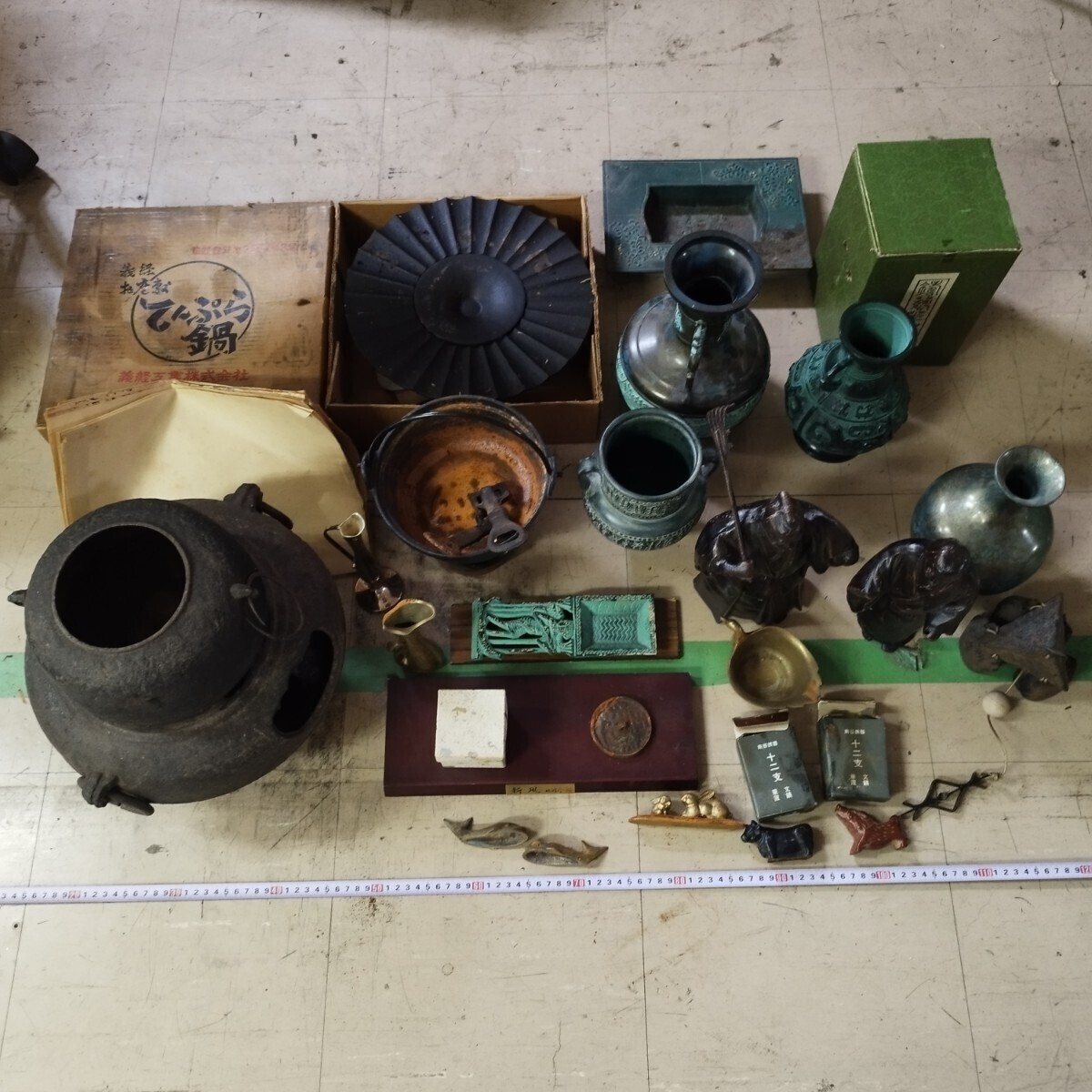 - 戸06b 鋳物/鋳鉄/鋳造 花器 茶器など 15点 以上まとめ/セット 花入/花瓶 つぼ/壺 文鎮 鍋 工芸品/伝統工芸/金属工芸 インテリア小物/置物