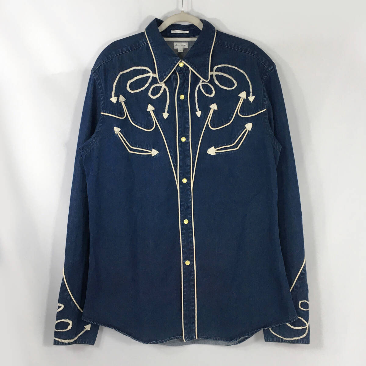 - ポールスミス ウエスタンシャツ デニム インディゴブルー×ホワイト 刺繍 パイピング 長袖 Lサイズ Paul Smith