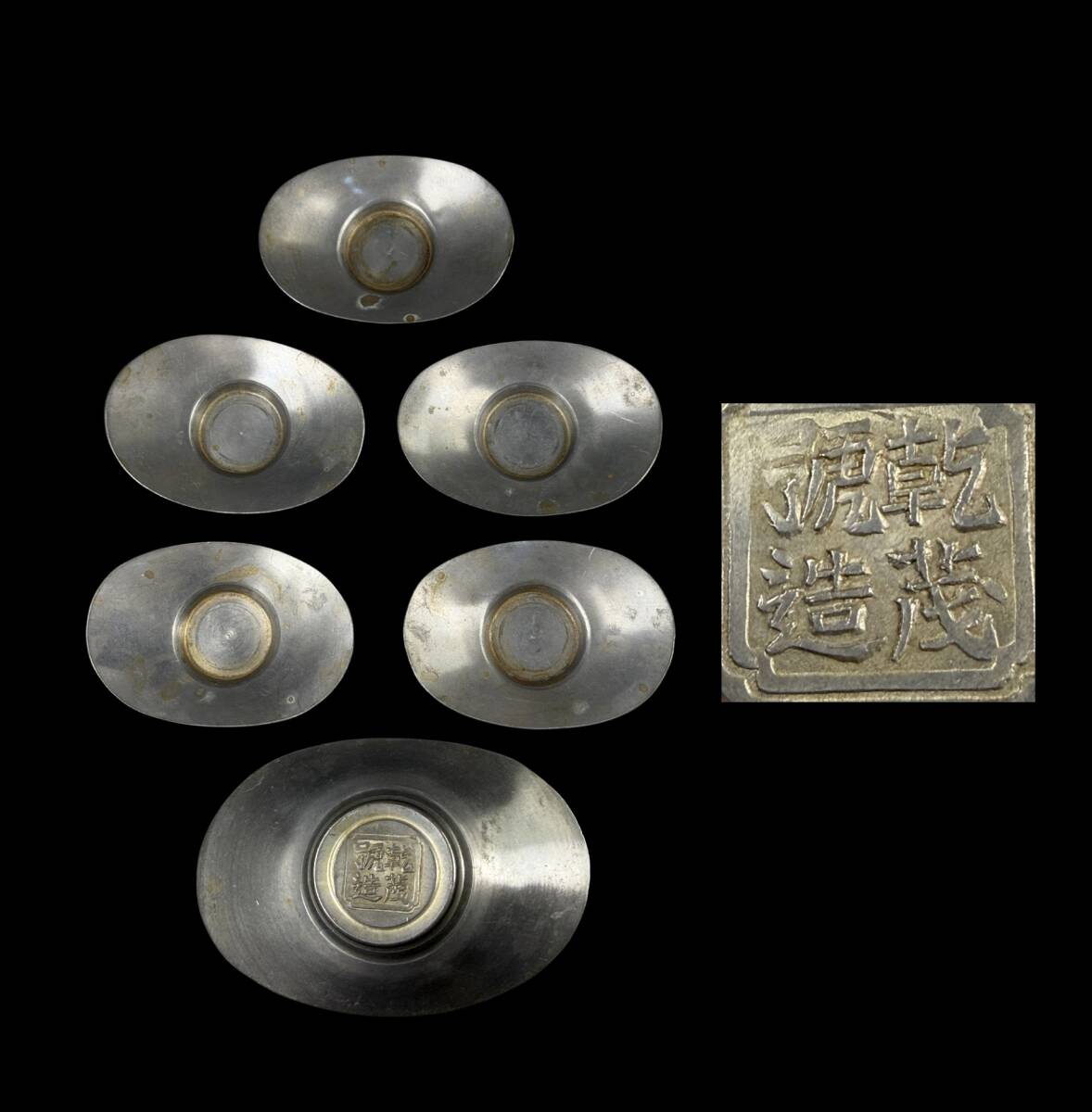 - 【偲】錫製 古錫 乾茂號造 茶托 托子 玉露 茶托 各五客 茶道具 煎茶道具 骨董 古美術 コレクション 在銘 重約82.88g 直径約5.8㌢ g-40