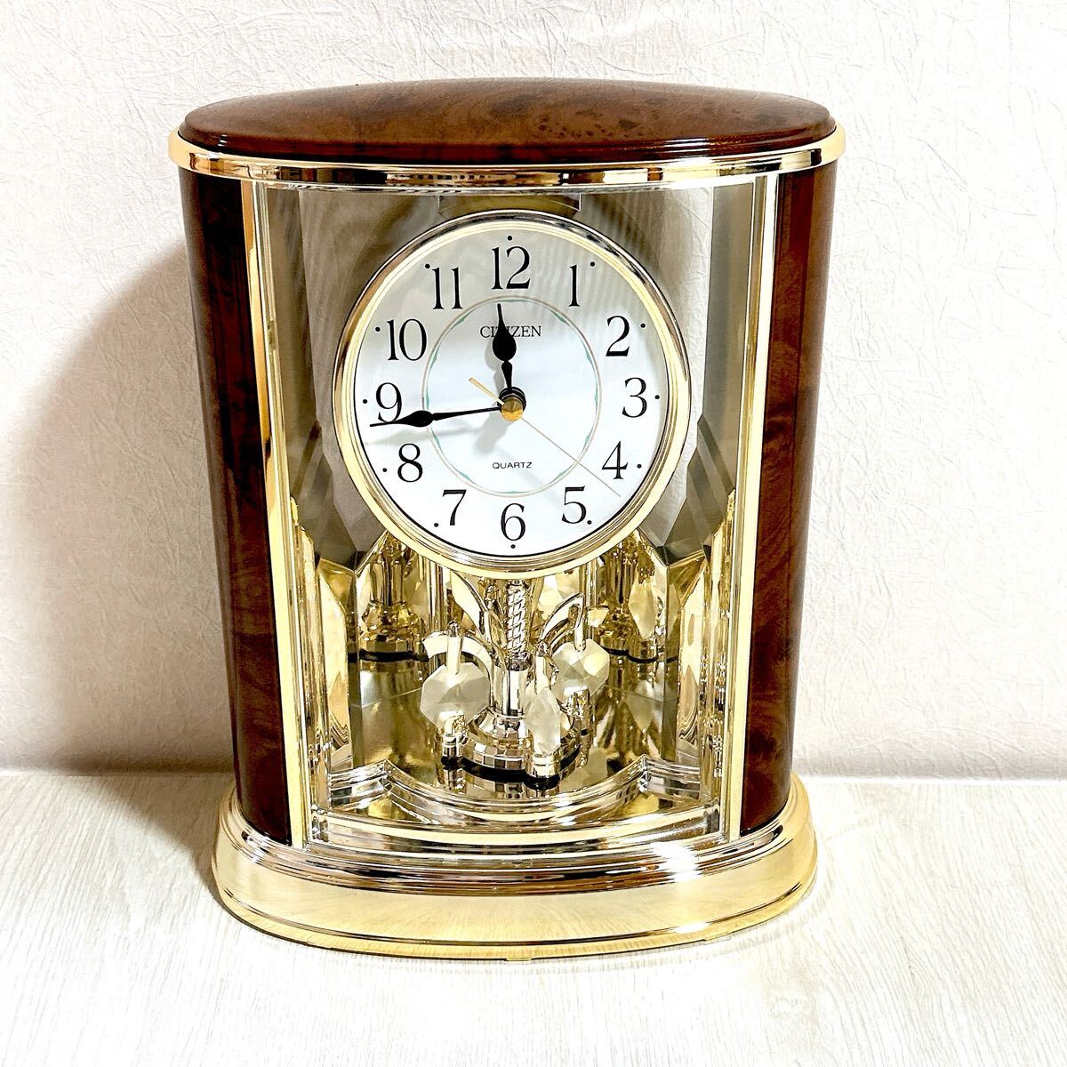 - 未使用難あり【CITIZEN】シチズン サルーンN 4SG724-N 06 クオーツ 置時計 からくり時計 豪華 茶色木目調 回転飾り インテリアとして YU