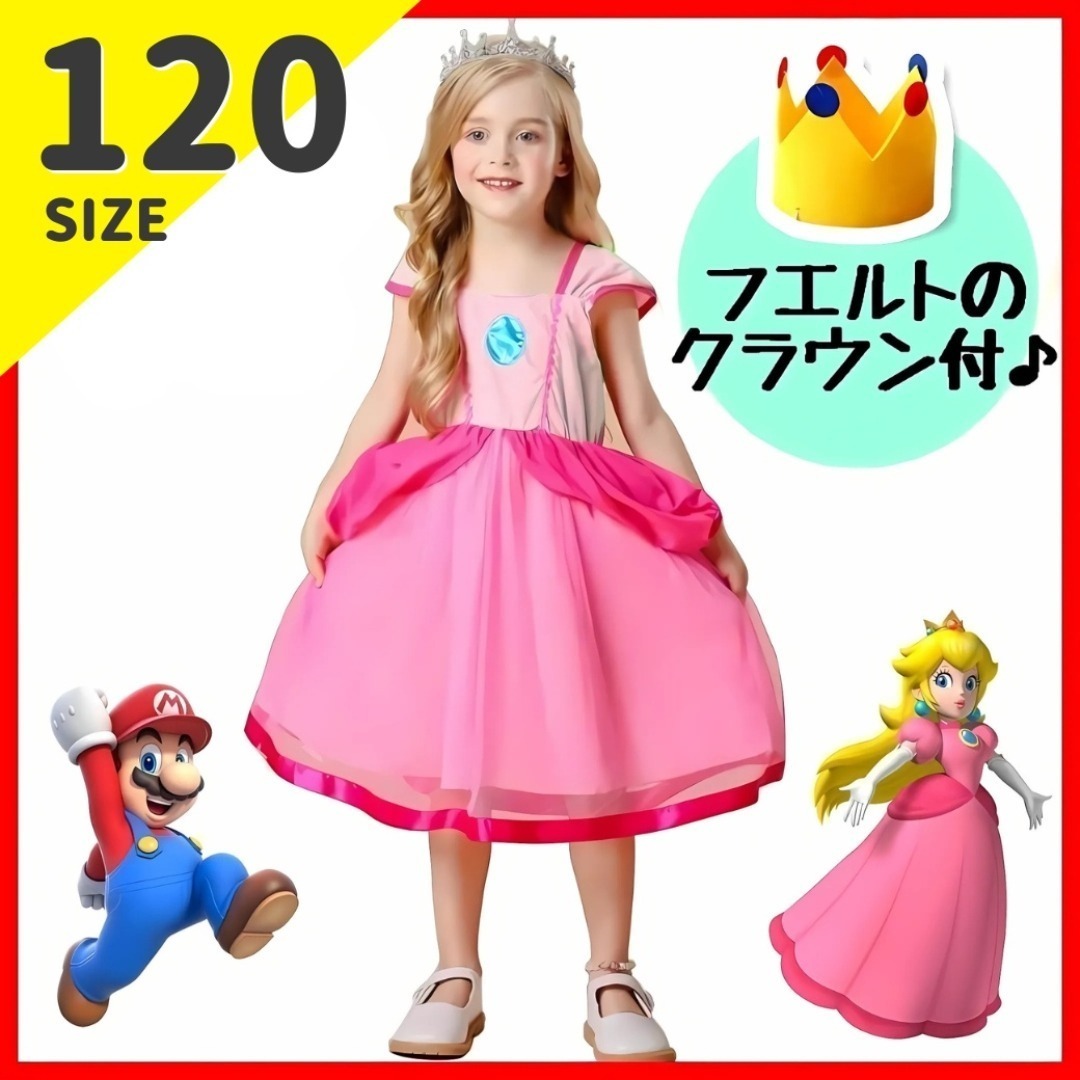 - 2点セット ピーチ姫 120cm コスプレ 子供 なりきり ドレス ハロウィン キッズ クラウン付 お誕生日 女の子 ユニバ ワンピース 半袖
