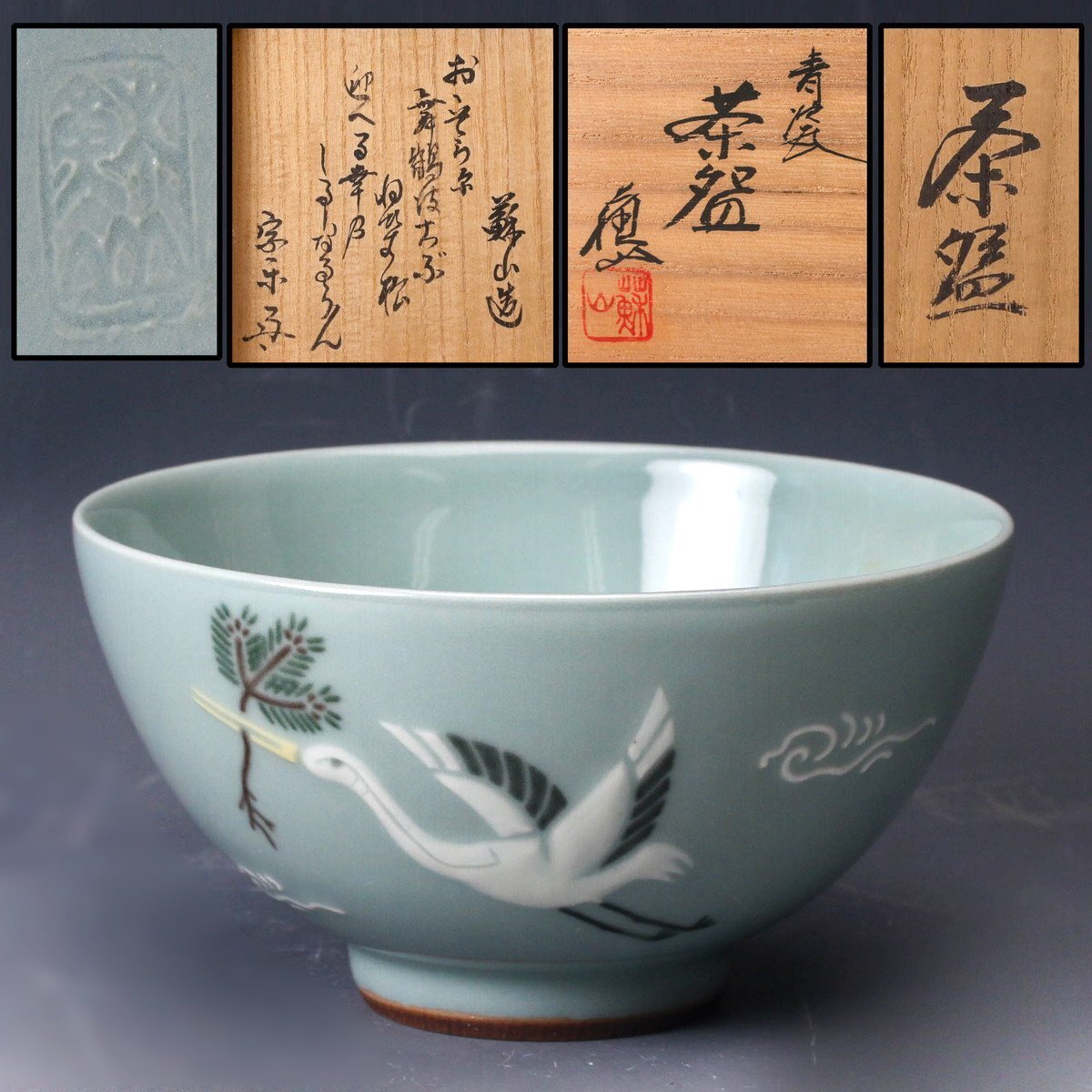 > 【佳香】三代 諏訪蘇山 松喰鶴画 青瓷茶碗 速水流七代速水宗楽書付箱 栞 茶道具 本物保証