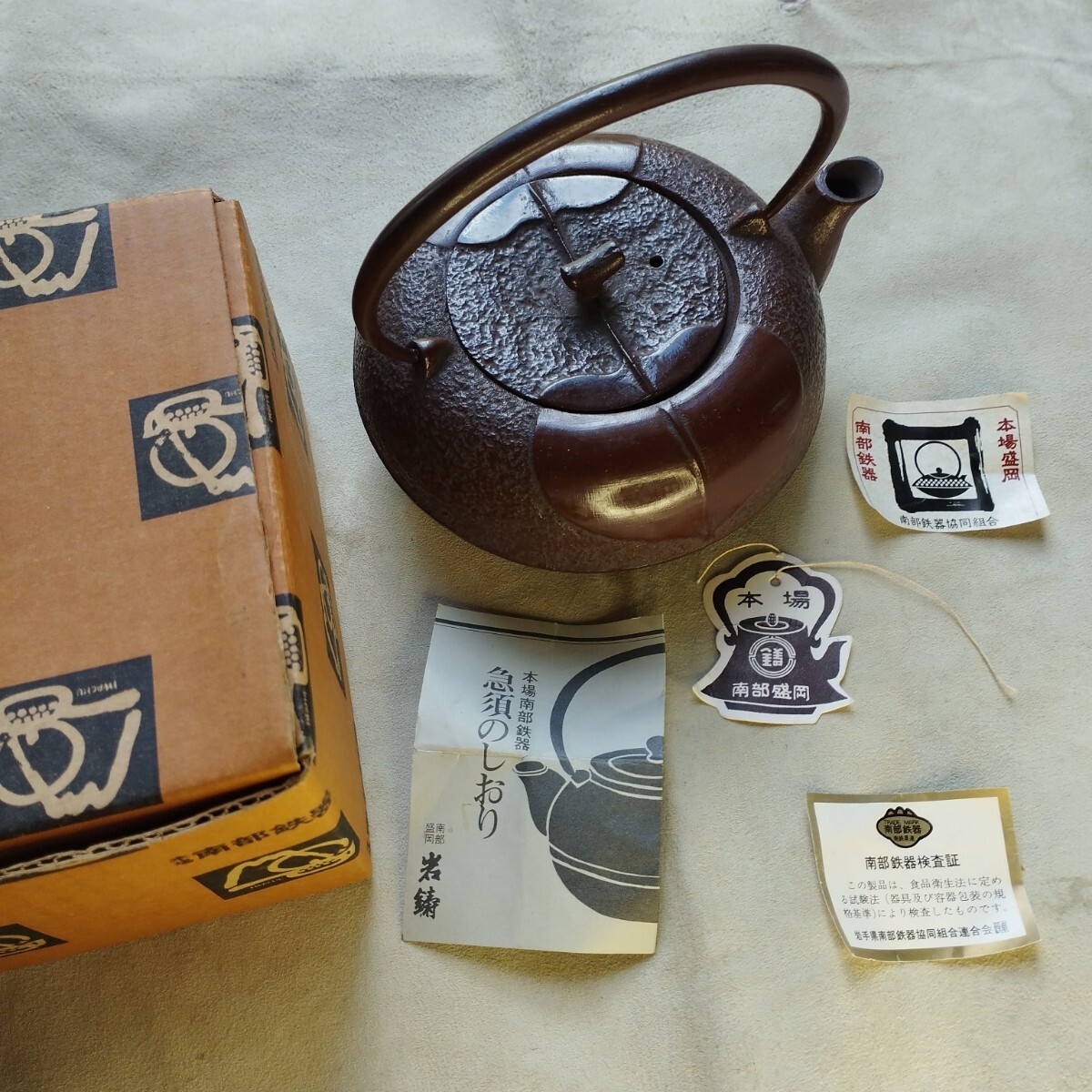 - 未使用 南部鉄器 岩鋳 鉄瓶 直径 13.5cm 柿文 元箱 取説付き