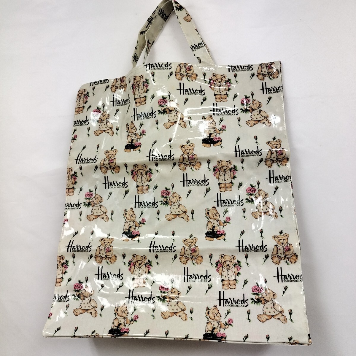 > 【美品】 Harrods ビニール トート バッグ エコバッグ ハロッズ くま テディベア バラ 総柄 KnightsBridge 大きめ 44.5×38×12.5