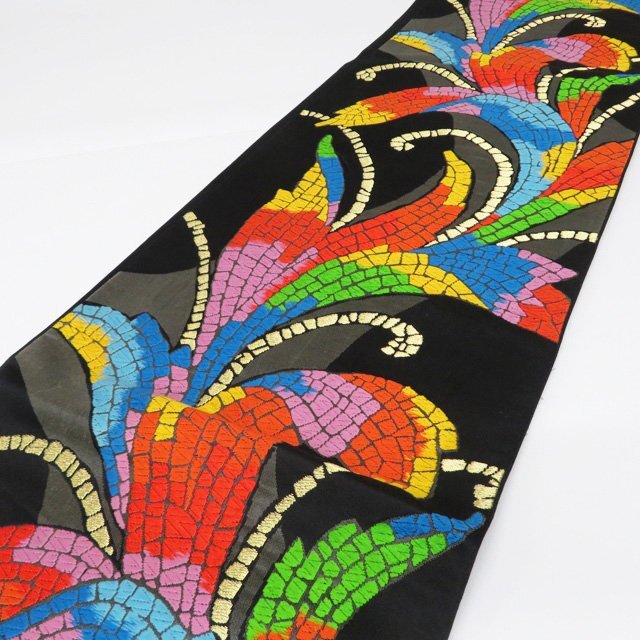 - ★きもの北條★ ステンドグラス風 モザイク柄 箔糸 六通 仕立て上がり 中古 正絹 袋帯 T801-16