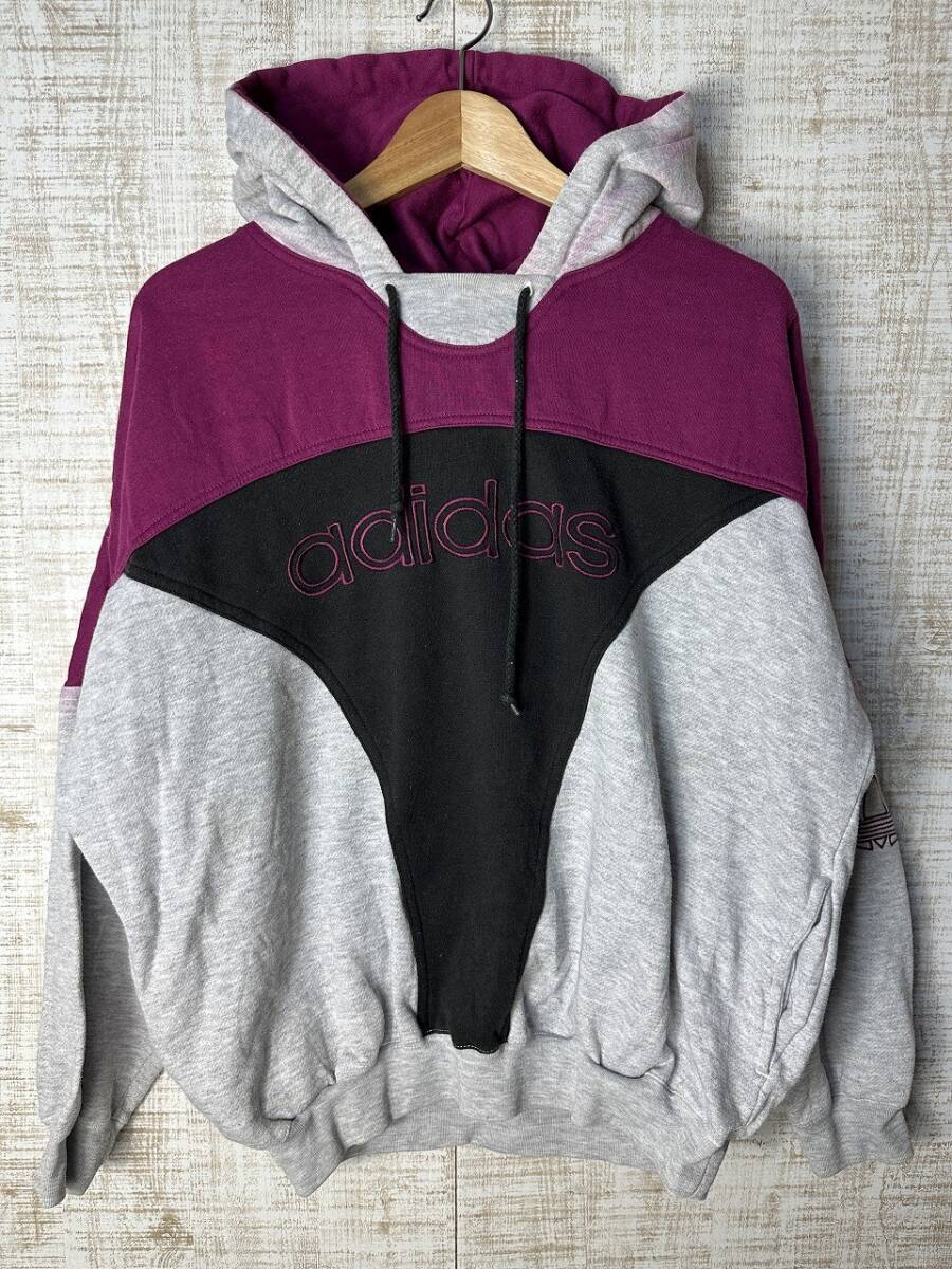 > ☆US古着 90s 90年代 adidas アディダス トレフォイル 三つ葉マーク スウェット フードパーカ レトロ グレー×紫×黒【M】裏起毛◆5242◆