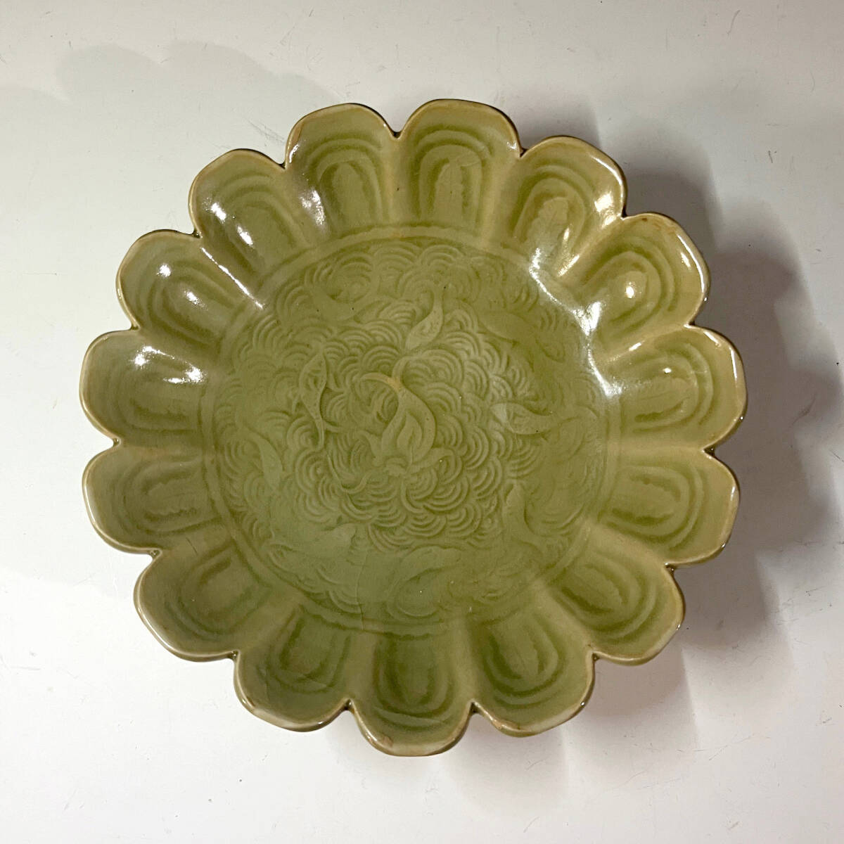 - 唐物 耀州窯 青磁陰刻波魚紋稜花盤 中国美術 古玩 B7-99