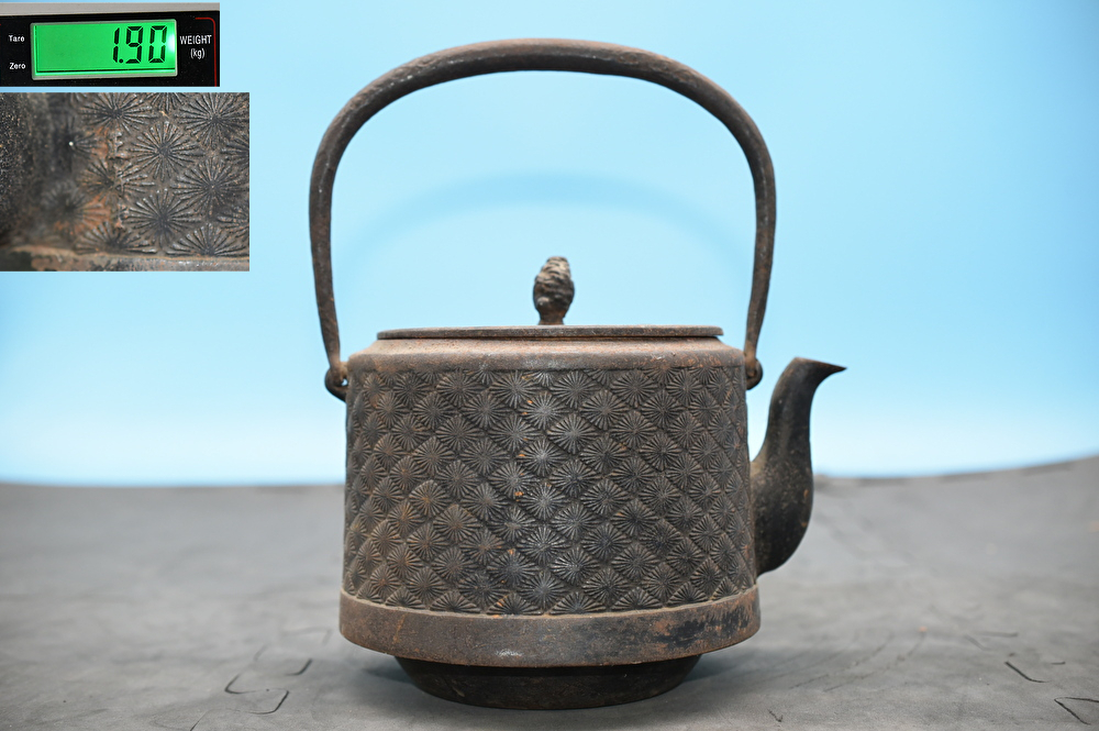 - TY10-10 玉寿堂 鉄瓶 松地紋 煎茶道具 松ぼっくり 湯沸かし 鉄やかん 茶道具 金属工芸 伝統工芸 水漏れ無 重量:約1.9kg 現状品