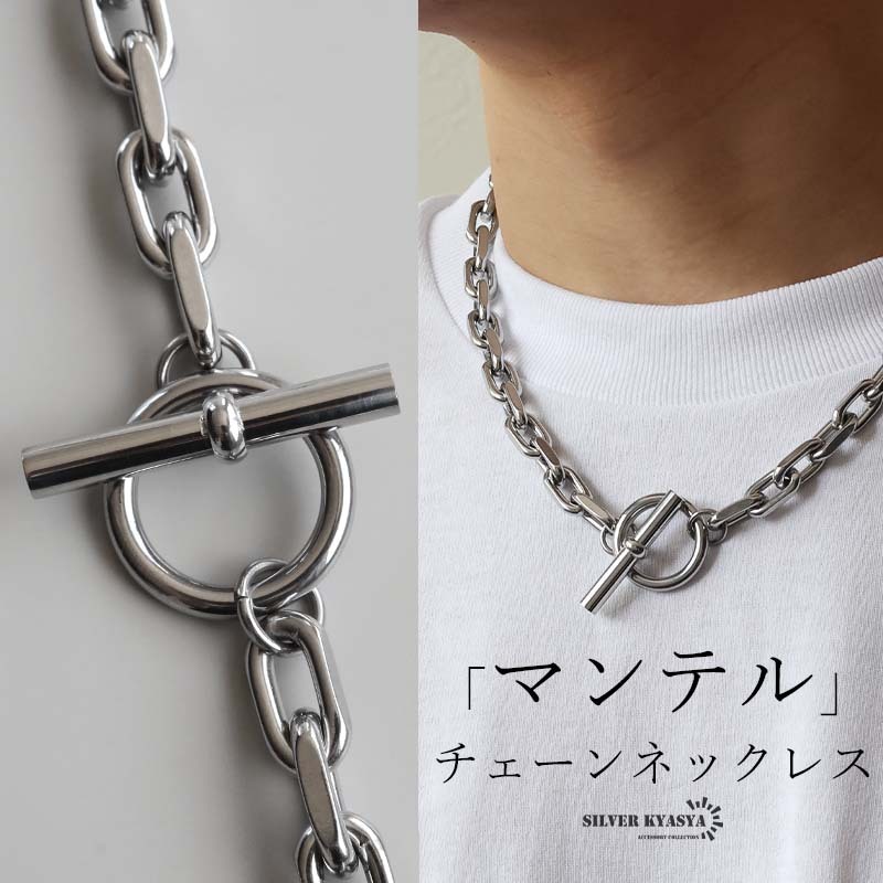 - ステンレス マンテルネックレス ごつめ 長小豆 コマ長 チェーンネックレス シルバー 重厚感 シンプル メンズ 男性 金アレ対応