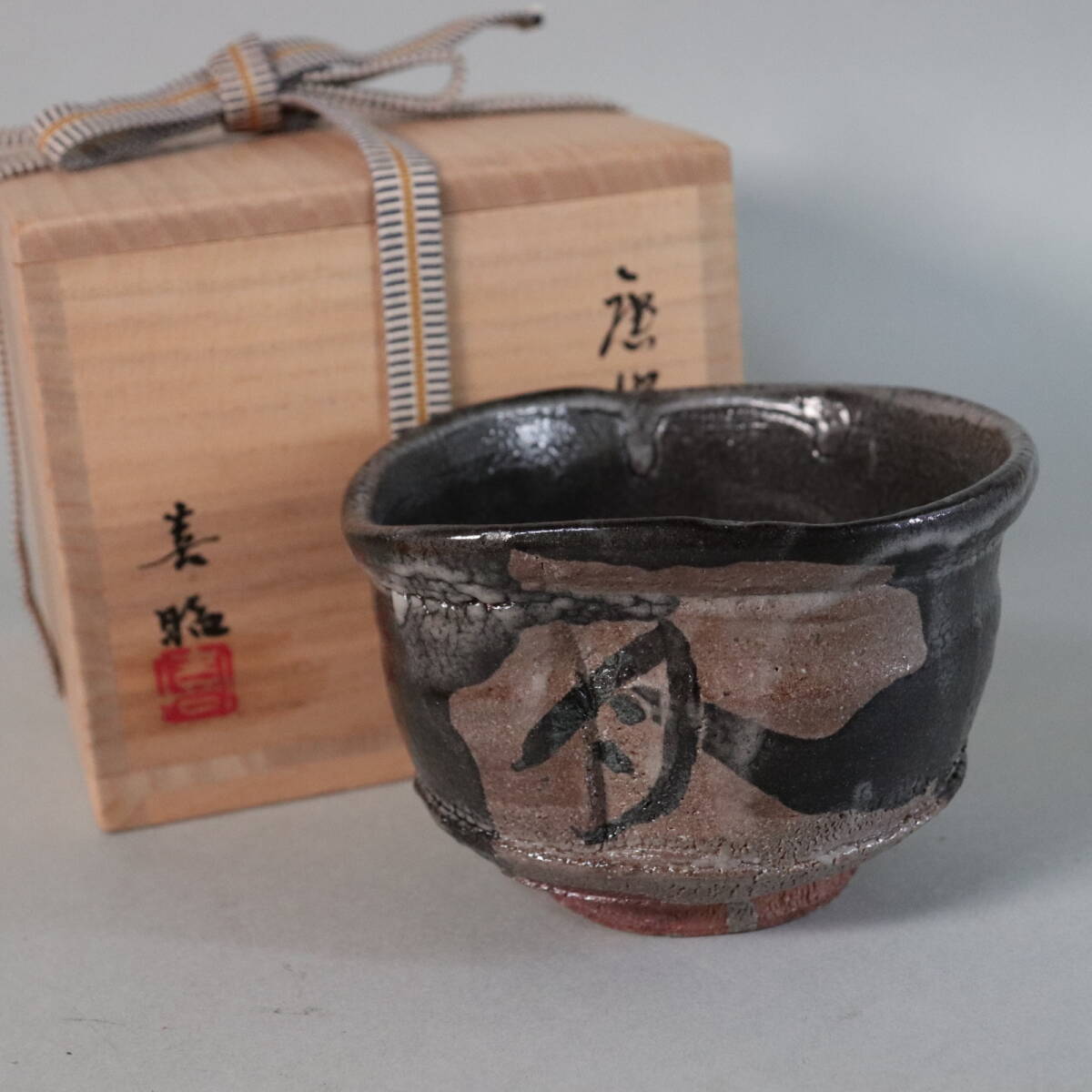 - 唐津焼 曹源窯 小島喜昭 作 唐津蛇蝎 沓形茶碗 共箱 茶道具 黒梅花皮 皮鯨 絵唐津 F0927C10