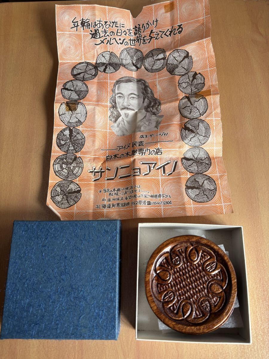 - 未使用 アイヌ民芸 木彫 コースター5枚セット 箱難あり