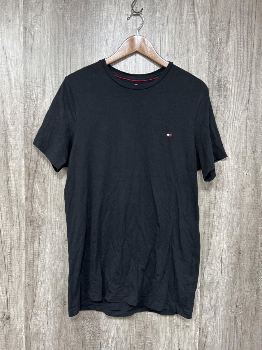 > ネコポスOK TOMMY HILFIGER トミーヒルフィガー 半袖 ワンポイントロゴ 刺繍 ロング Tシャツ sizeM/黒 ■◆ メンズ
