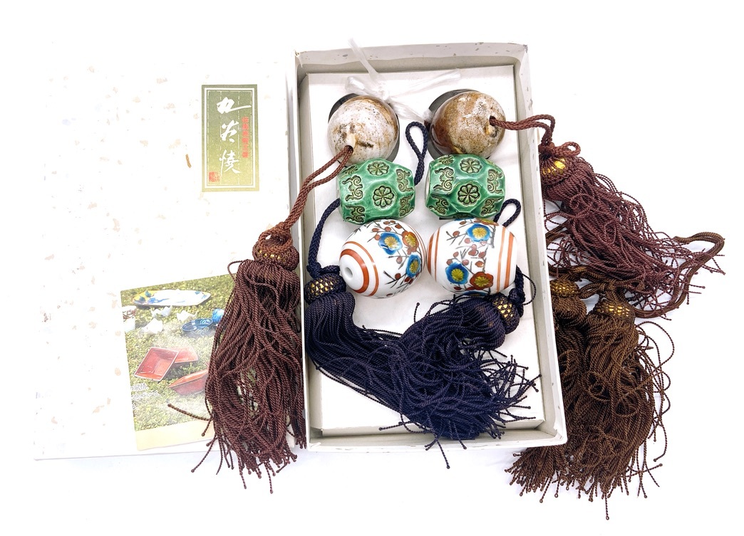 > 【22252】九谷焼 掛軸 風鎮 箱あり 石川 陶磁器 上絵 インテリア 山水 花鳥 色彩 床の間 和室 重り 錘 絵 装飾品 お花 色付け