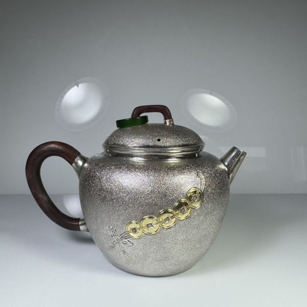 - 純銀製 古銭 急須 貴石摘 木取手 銀瓶 煎茶 長さ約12cm 純銀保証