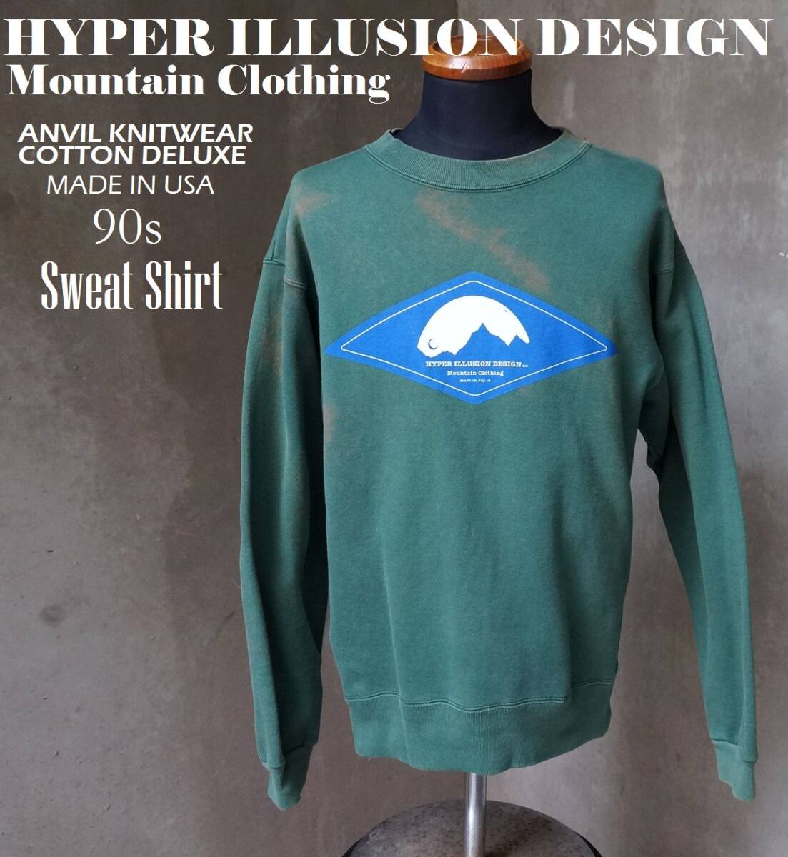 > 90s HYPER ILLUSION DESIGN 緑 グリーン USA製 ANVIL KNITWEAR COTTON DELUXE スウェット シャツ トレーナー M