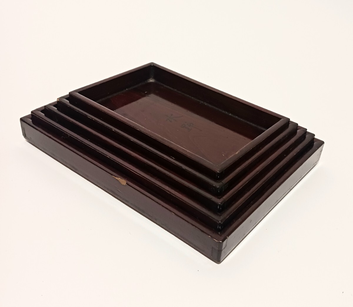 - 時代 切留 五段 入れ子 蓋 漆器 民藝 民芸品 古民具 古道具 天然木 四方盆 骨董