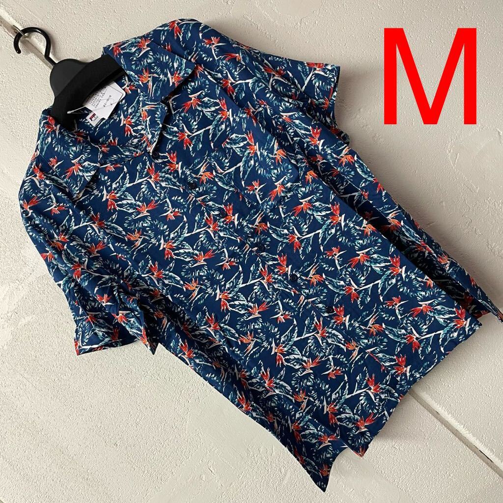 - Mサイズメンズ前ボタンプリント半袖シャツブラウス ネイビー朱色 アロハシャツ