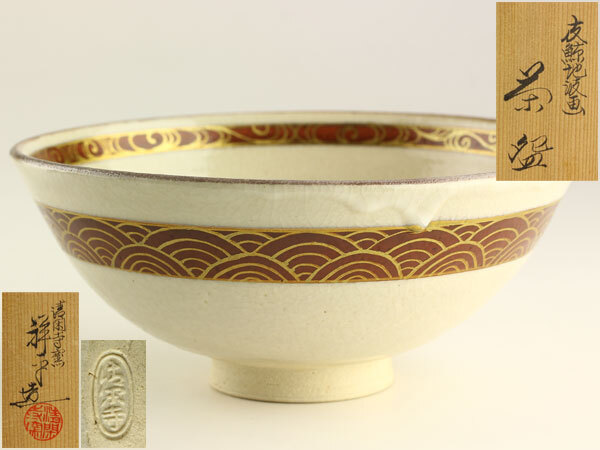- 茶道具 清閑寺窯 杉田祥平 友鯨地波画 茶碗 共箱 I3017