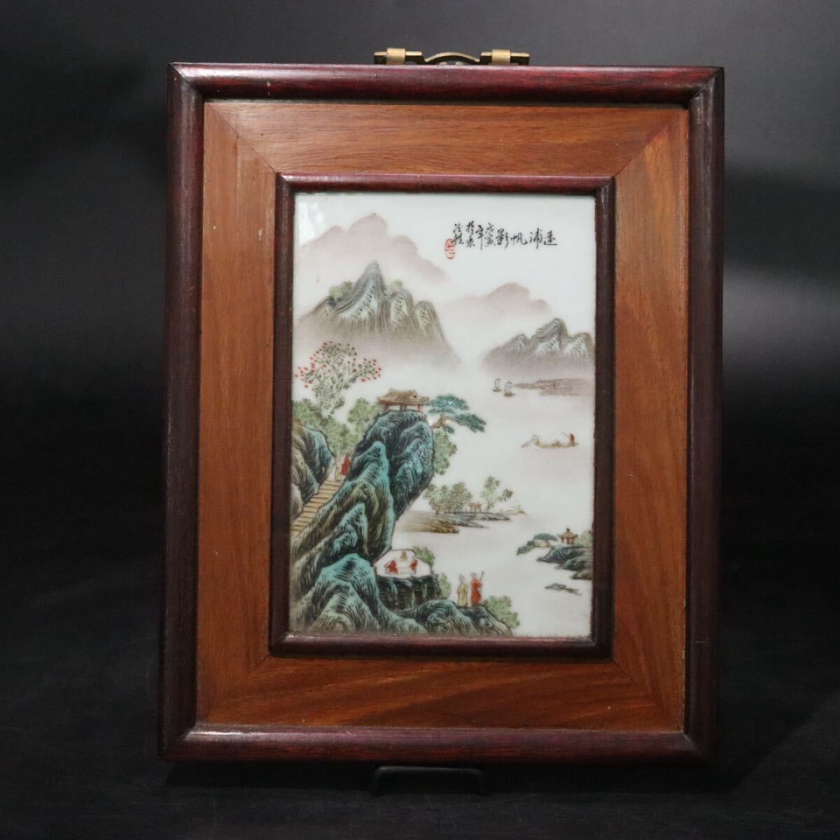 > 時代 墨彩 山水図 陶板 在銘 額装 / 中国美術 色絵 磁器 煎茶道具 検索: 唐木 紫檀 .B1171