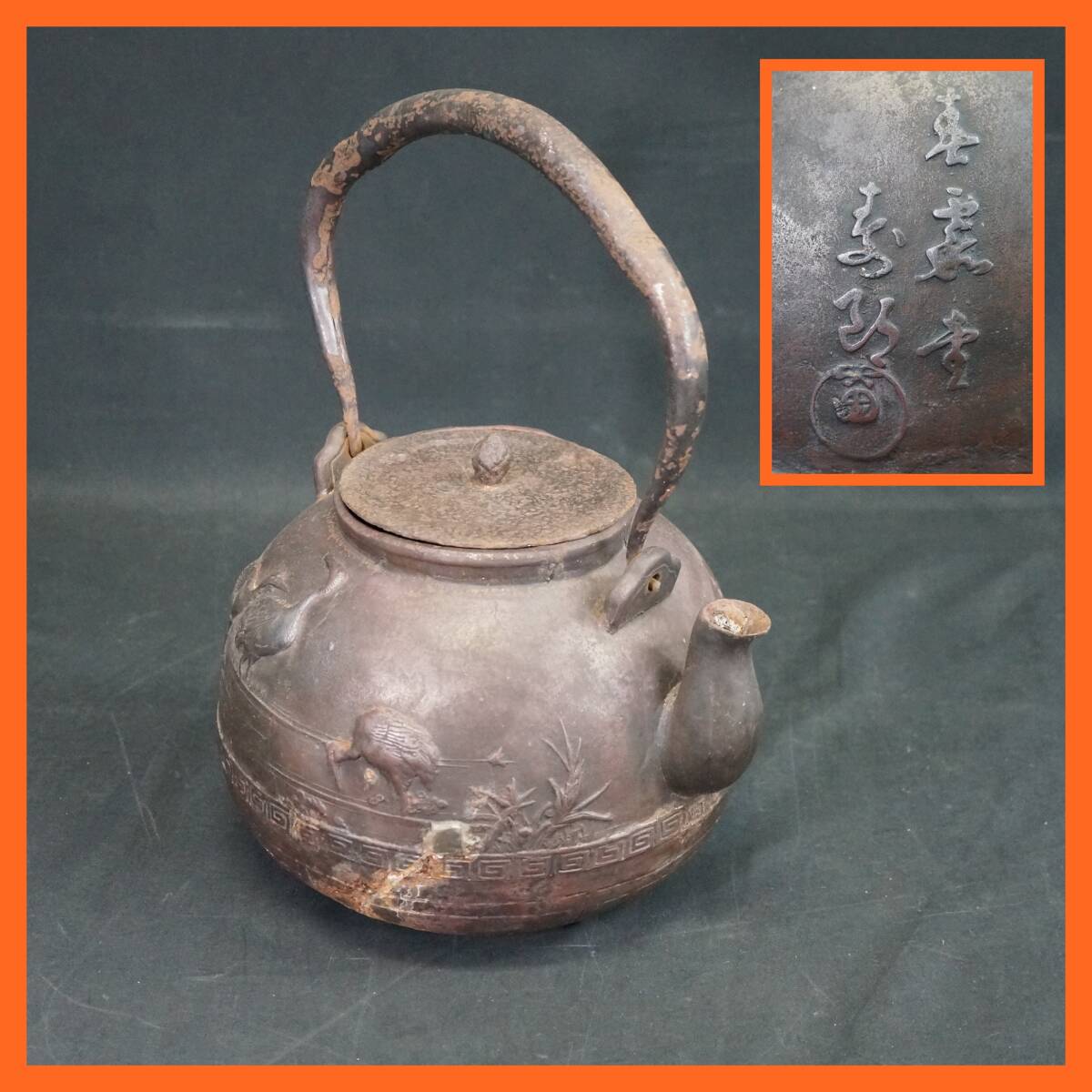 - 東ハ:【茶道具】寿郎 銘入り 浮彫 雷文 鉄瓶 全高約36㎝ 特大鉄瓶 時代物 湯沸かし 煎茶道具 ★送料無料★