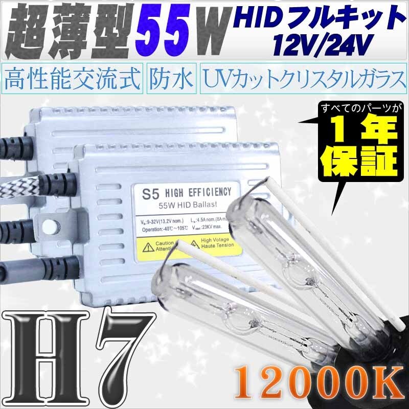 - 高性能 薄型HIDキット 55W H7 12000K 12V/24V 【交流式バラスト&クリスタルガラスバーナー】