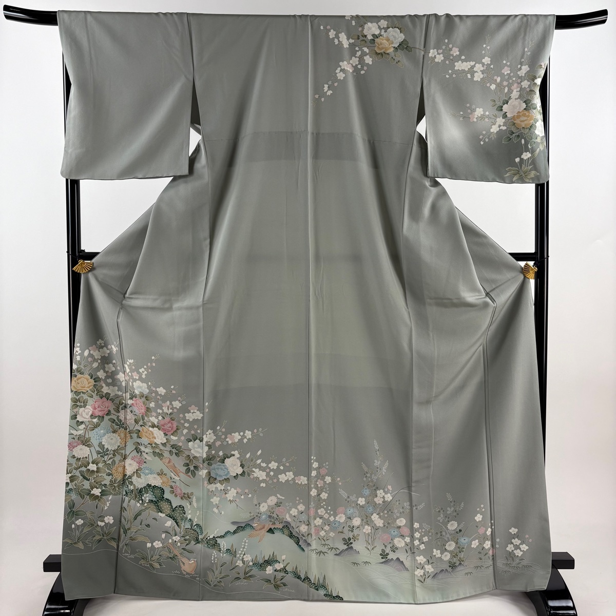 > 訪問着 身丈169.5cm 裄丈69cm L 袷 枝花 鳥 ぼかし 灰緑 正絹 秀品 【中古】