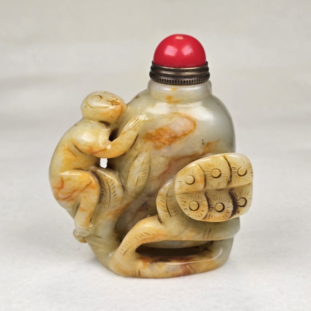 - 中国古美術 本物和田玉 手彫 清代 猿と松枝紋 雅趣 鼻煙壺 薬瓶 美品