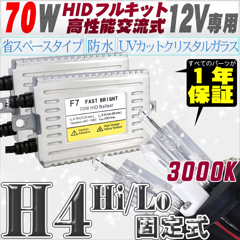 > 高性能 HIDキット 70W H4 Hi/Lo固定式 3000K 【交流式バラスト&クリスタルガラスバーナー】 12V用